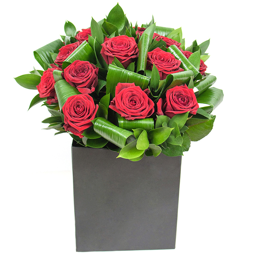 Bring refinement to your home with our Refined Red Rose Bouquet. This elegant arrangement features vibrant red roses, complemented by lush aspidistra leaves and soft ruscus, creating a harmonious and stylish display.