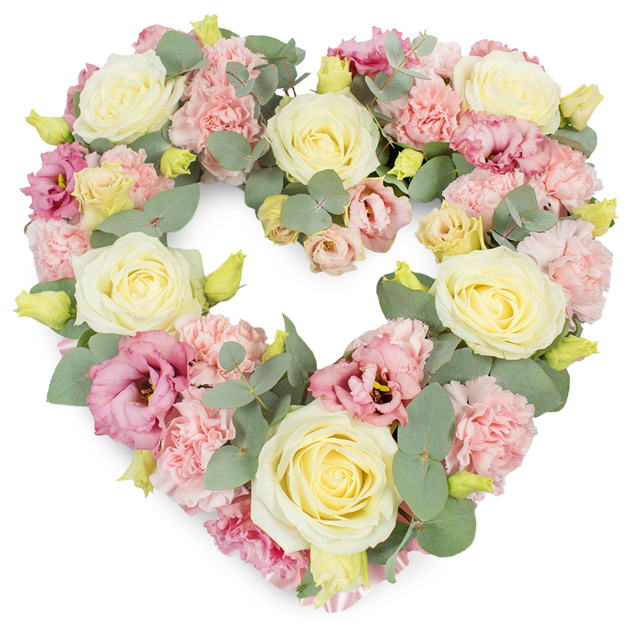 Express your love and remembrance with our Beautiful Open Heart Bouquet, a meticulously arranged floral tribute. This stunning arrangement showcases elegant white roses, charming pink carnations, delicate pink lisianthus, and lush eucalyptus leaves, creating a unique and heartfelt display.